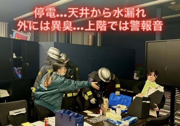 《停電したと思ったら、天井から水漏れ!外には異臭が発生し、上階の一部屋から警報音が鳴っているので119番通報しました!》