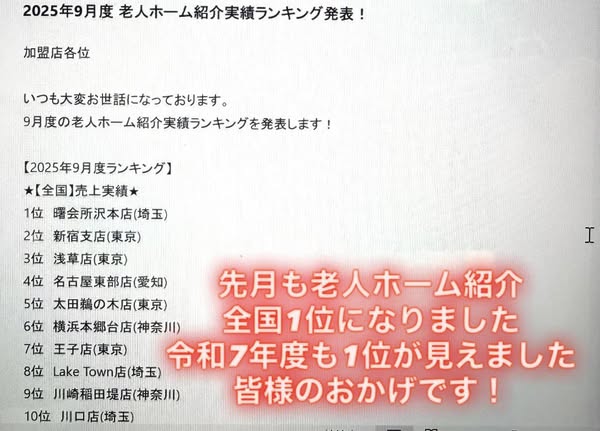 お取引先様皆様のおかげで、先月も老人ホーム紹介件数全国1位の座を守るとが出来ました いつも本当にありがとうございます