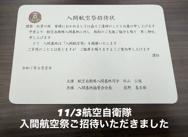 航空自衛隊 入間基地より航空祭のご招待状をいただきました我が国の防衛力を今年もこの目に焼き付けて参ります
