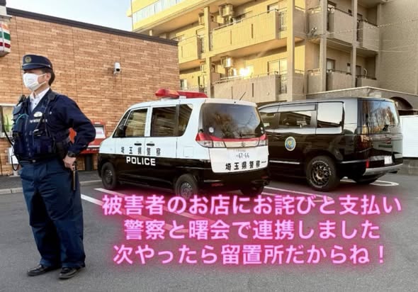 現場検証で本人はパトカーに乗って、曙会号が追走して現場に向かいました 被害額を代償して被害店にお詫びをしました