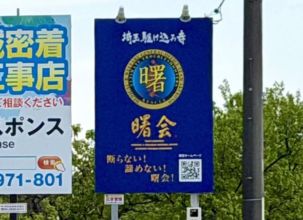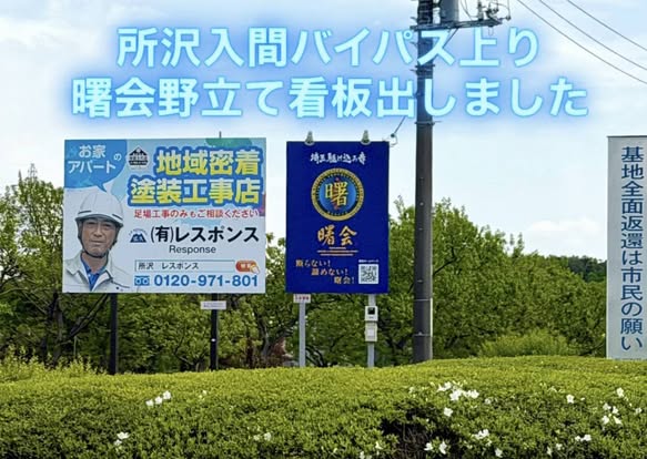 所沢入間バイパス・国道463号バイパス〜東京都道・埼玉県道4号東京所沢線上り入間方面から東に向かった左側、エネオス・ブロンコビリー・丸源ラーメン・コナズ珈琲の手前辺りに、曙会の初野立て看板を設置しました