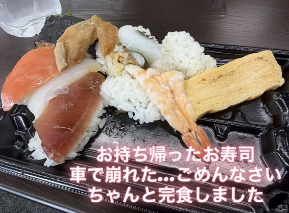 次の仕事があったため、ご用意いただいたお寿司を車内で落としてしまい、ネタが…ちゃんと完食しました!