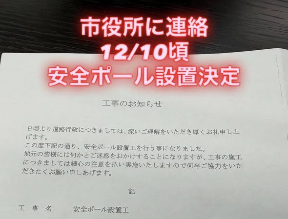 流石に安全ポールが折れたままの状態で、同様の事故が繰り返されるのは問題と感じ、直接 市役所の担当部署に連絡