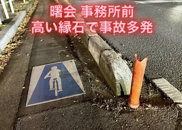 曙会 小手指事務所の前、高い縁石があり安全ポールはへし折れています