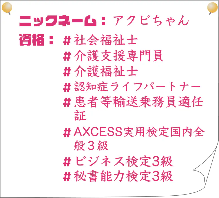 - 主に介護支援専門員として頑張ってくれていますが、会社の経理や総務もコツコツと支えてくれています。スタッフが働きやすい環境を常に考えてくれて、いただき物のお菓子など平等に分けてくれる担当も担ってくれています。